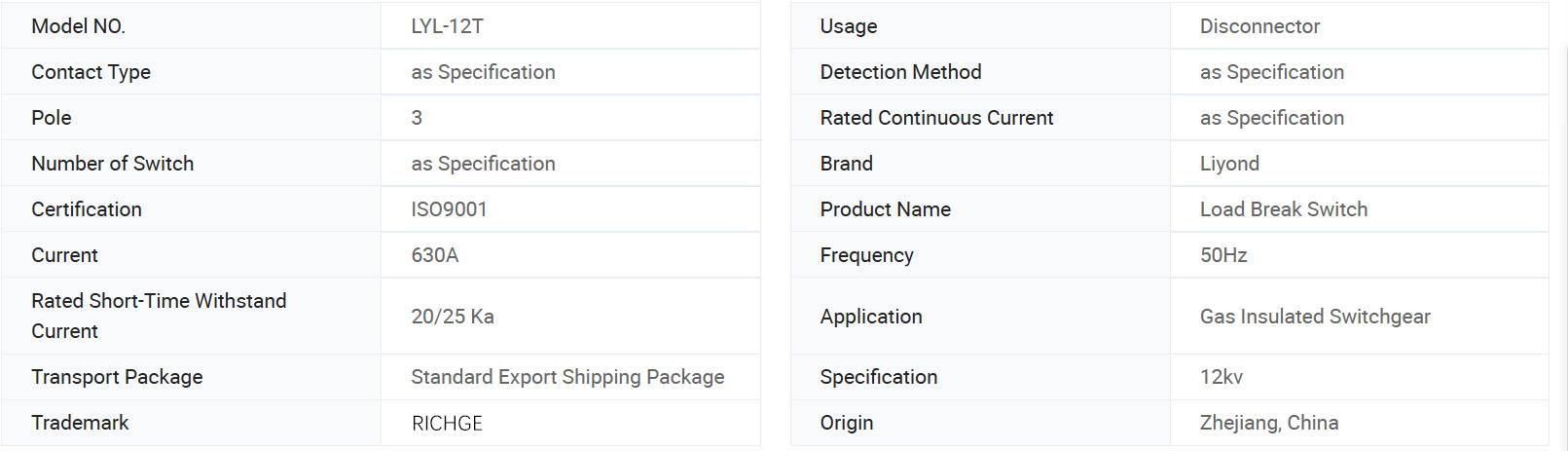 LYL-12T بوجھ سوئچ GB3804-2004 "3.6KV ~ 40.5KV ہائی وولٹیج AC لوڈ سوئچ" اور GB16926-1997 "AC ہائی وولٹیج لوڈ سوئچ فیز امتزاج کے آلے" کی متعلقہ ضروریات کے مطابق ہے۔ مین سرکٹ: 630a-20ka (4s) ، 25KA (3S) ؛ مکینیکل زندگی: 5000 بار ؛ گراؤنڈنگ سرکٹ: 20KA (2s) ؛ مکینیکل زندگی: 2000 بار۔