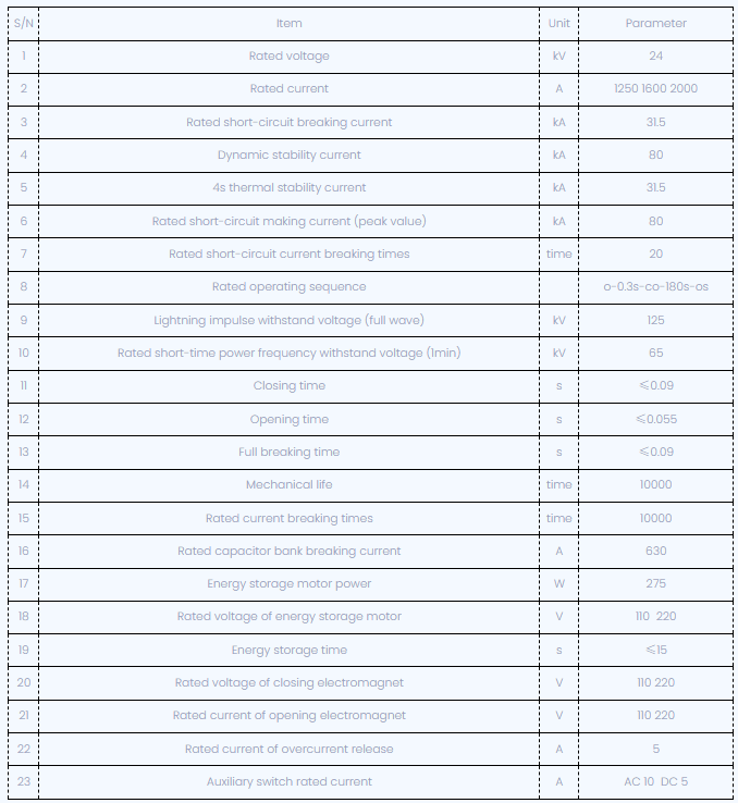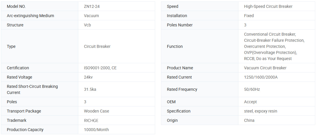 Zn12-24 ویکیوم سرکٹ بریکر ایک انڈور ہائی وولٹیج سوئچ گیئر ہے جس میں 24KV اور تین فیز AC 50Hz کی درجہ بندی والی وولٹیج ہے۔ جس نے جرمن کمپنی سے ٹیکنالوجی متعارف کرائی ہے , اس کا آپریٹنگ میکانزم ایک موسم بہار کی توانائی کے ذخیرہ کرنے کی قسم ہے ، جو AC یا DC ، یا دستی طور پر چلا سکتا ہے۔ یہ سرکٹ بریکر ایک پربلت موصلیت کی قسم ہے ، جو کلاس II کے آلودہ علاقوں میں استعمال کے ماحول کی ضروریات کو پورا کرتی ہے۔ اس سرکٹ بریکر میں سادہ ساخت ، مضبوط توڑنے کی گنجائش ، لمبی زندگی ، مکمل آپریشن کے افعال ، کوئی دھماکے کا خطرہ ، سادہ بحالی ، پاور پلانٹ کے کنٹرول یا تحفظ سوئچ ، سب اسٹیشن اور دیگر ٹرانسمیشن اور تقسیم کے نظام کے لئے موزوں ہے ، خاص طور پر اہم بوجھ اور کثرت سے چلنے والی جگہوں کو توڑنے کے لئے موزوں ہے۔ یہ پروڈکٹ GB1984 ، JB3855 ، DL403 اور IEC معیارات کی متعلقہ ضرورت کے مطابق ہے۔