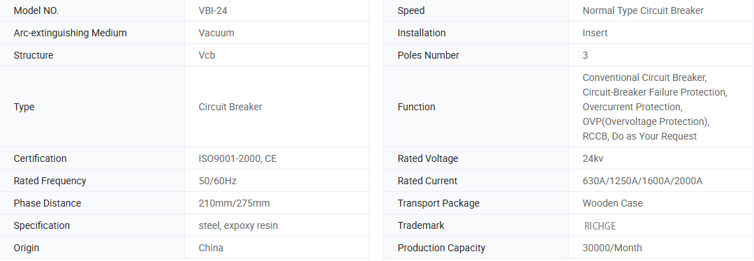 VBII-24 سائیڈ ماونٹڈ قسم ویکیوم سرکٹ بیکر کے آپریشن میکانزم کا استعمال موسم بہار میں اسٹوریج انرجی سے کیا جاتا ہے ، جو دو طریقوں سے ، دستی یا بجلی کے ذریعہ چلایا جاسکتا ہے۔ خصوصیات GB1984-89 ، JB3855-96 کے مطابق ہیں۔<10kv Indoor High Voltage Vacuum Circuit Breaker General Technical Specifications>، IEC56 معیار کی متعلقہ دفعات۔